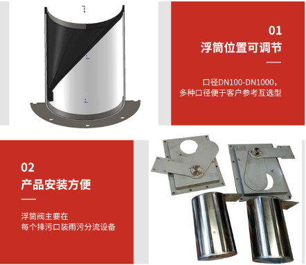 浮筒閥:又叫自控截污裝置,利用浮筒升降調(diào)節(jié)的一款閥門,整體材質(zhì)304不銹鋼耐腐蝕性能很好,使用壽命長,主要利用浮力的原理實現(xiàn)初期雨水截流。